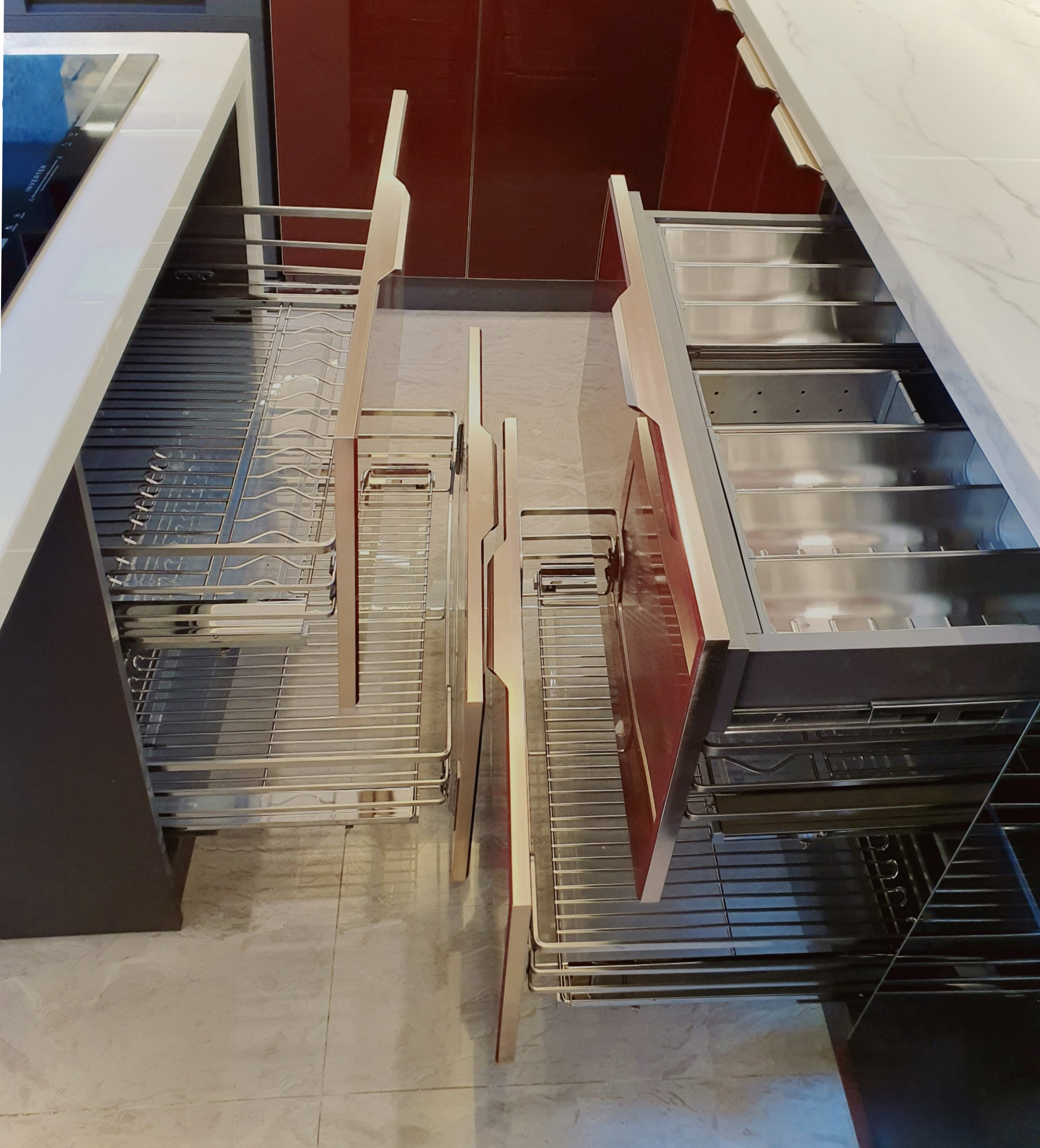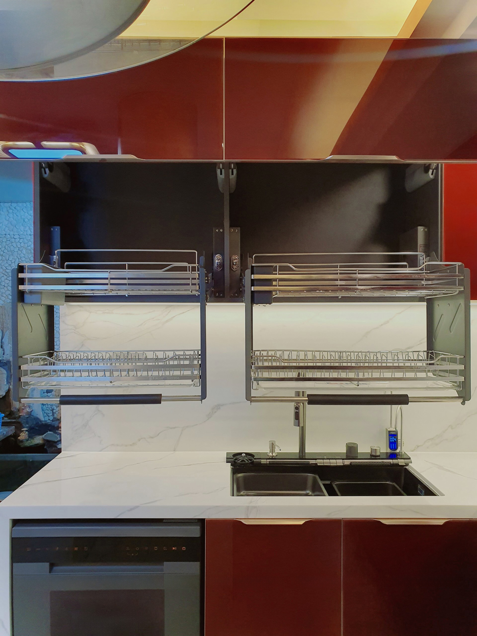 - Hệ thống giá bát nâng hạ bằng piston giúp việc lấy và cất bát đĩa trở nên nhẹ nhàng, tiện lợi.