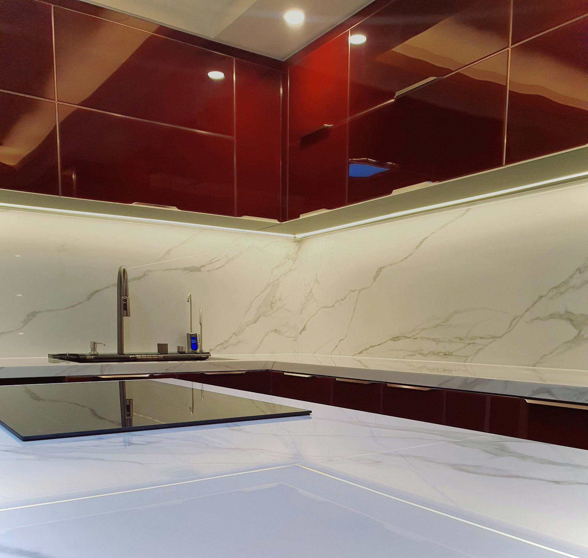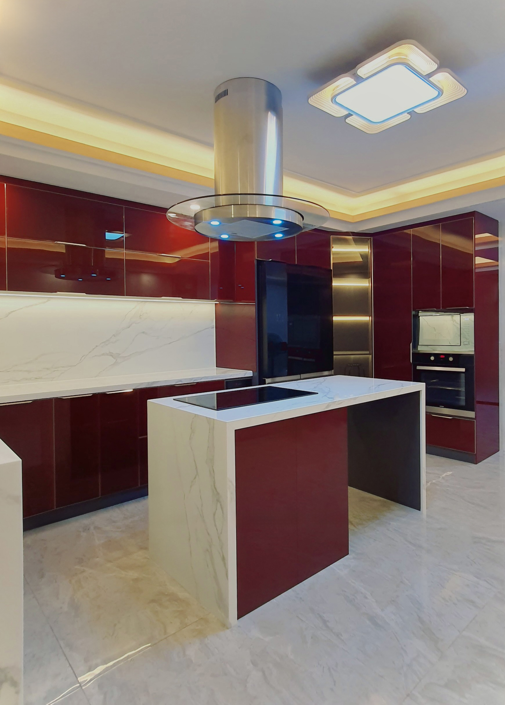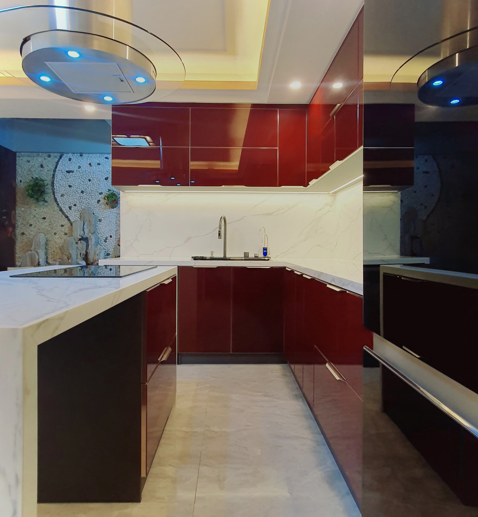 Thi công dự án tủ bếp nhôm cánh kính đỏ rượu vang cao cấp tại Tân Bình